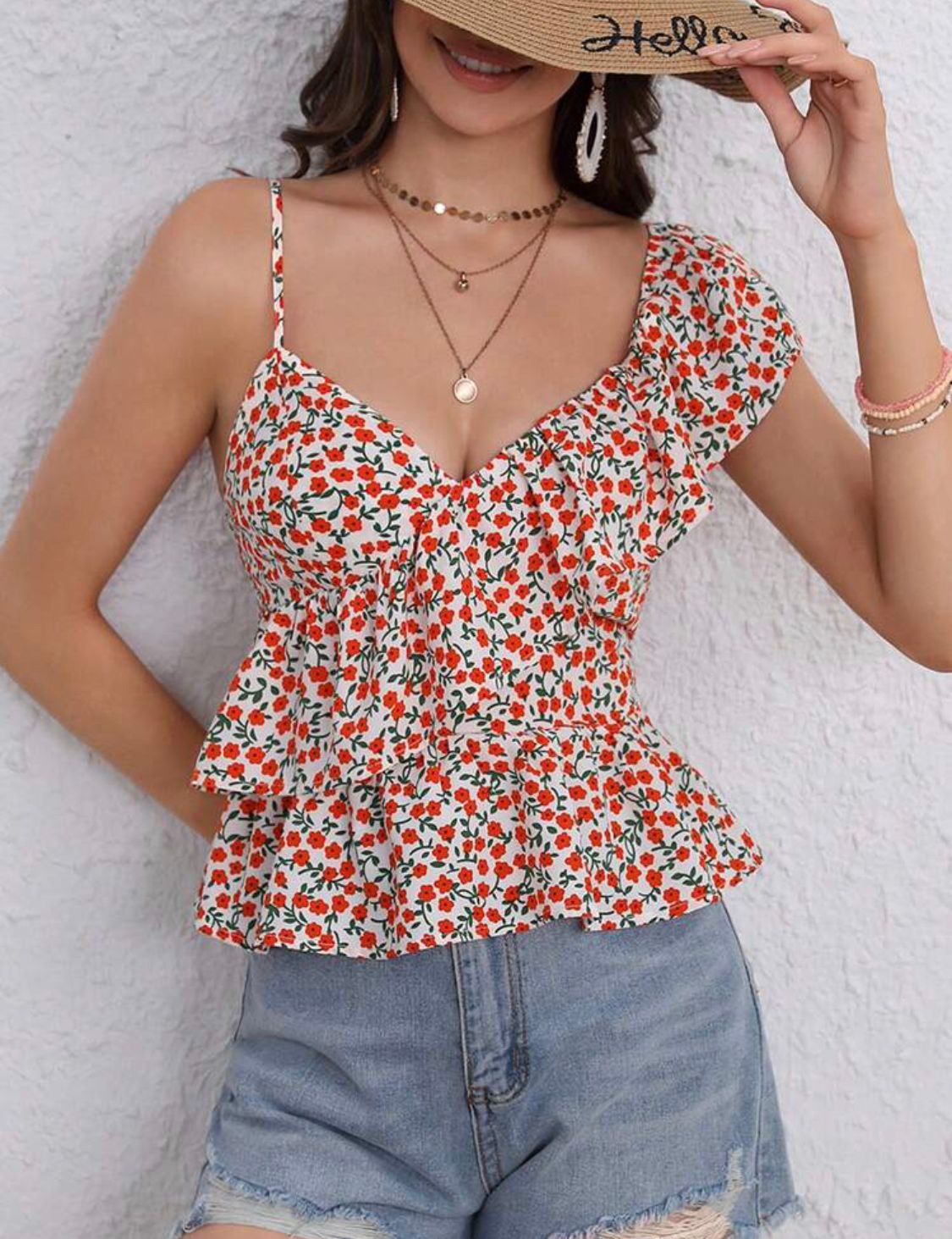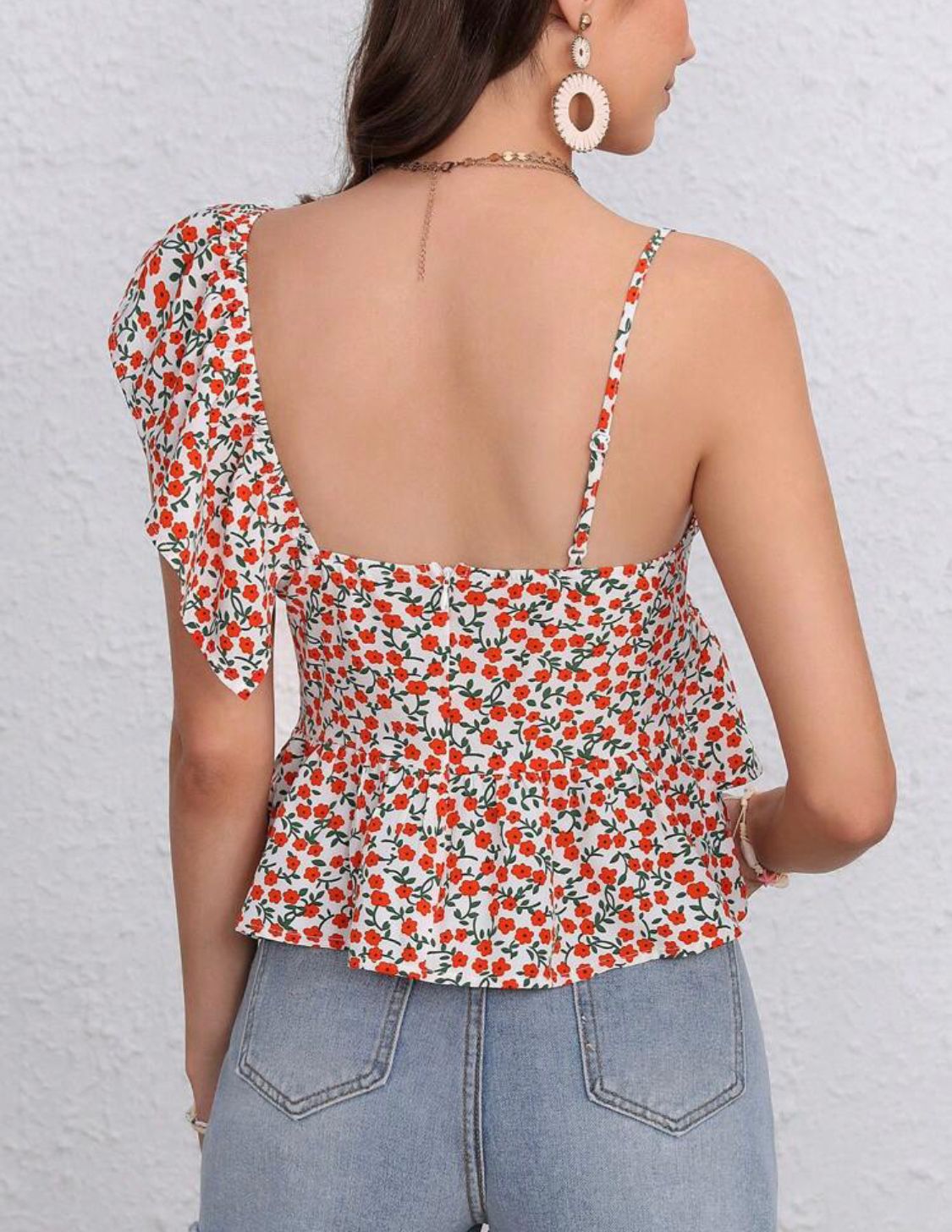 Ditsy Floral Print Asymmetrical Neck Ruffle Trim Peplum Blouse