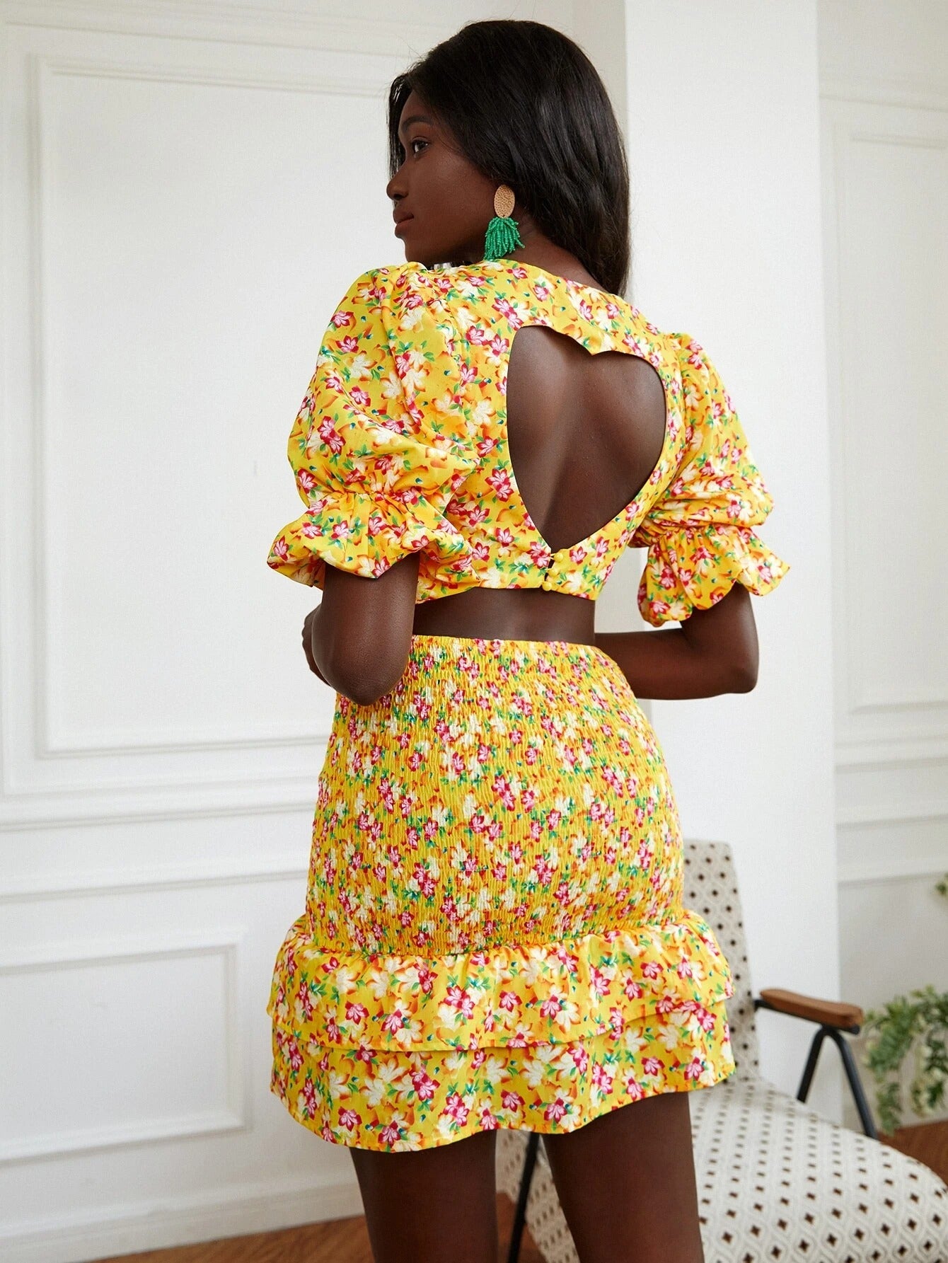 Floral Print Ruffle Cuff Top And Shirred Ruffle Hem Skirt Set