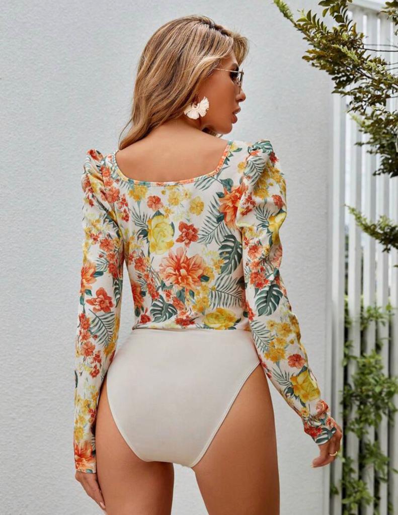 Floral Print Square Neck Puff Sleeve Bodysuit