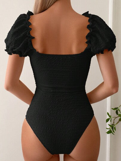 One-Piece Swimsuit With Bubble Sleeves In Solid Color