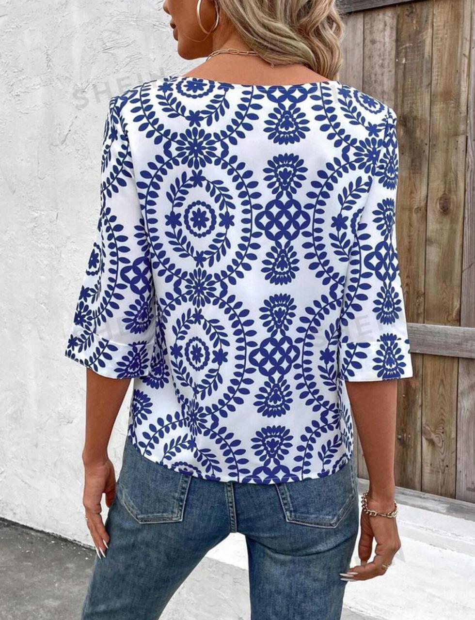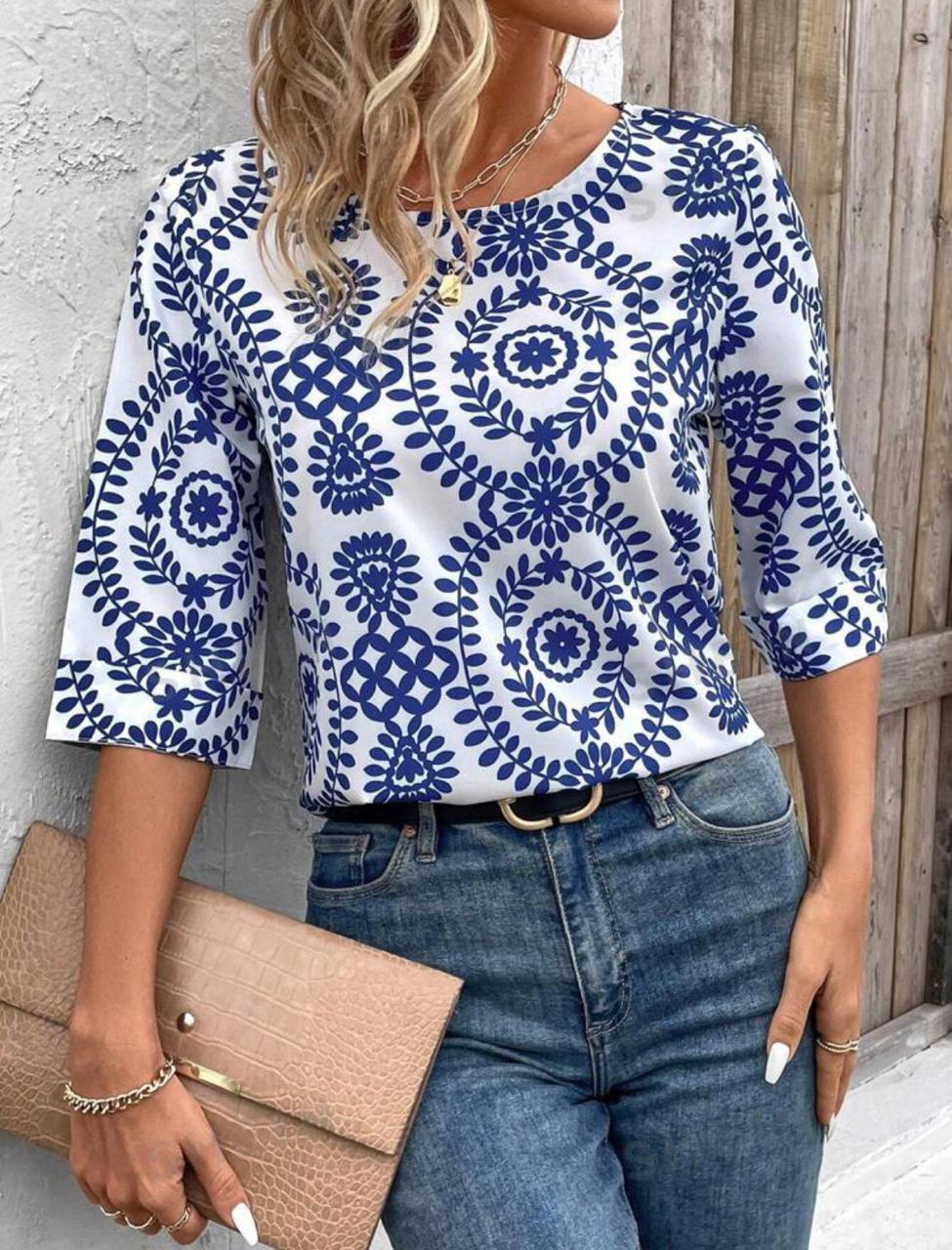 Printed Round Neck Three Quarter Sleeve Blouse