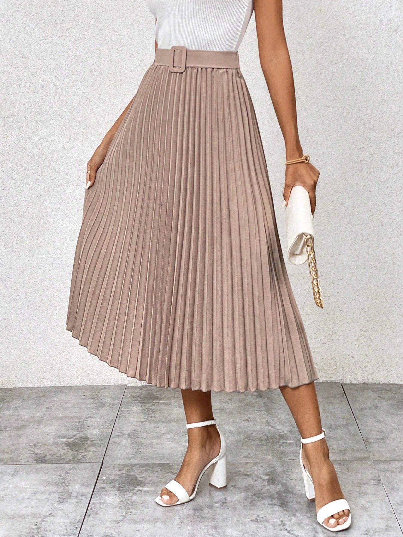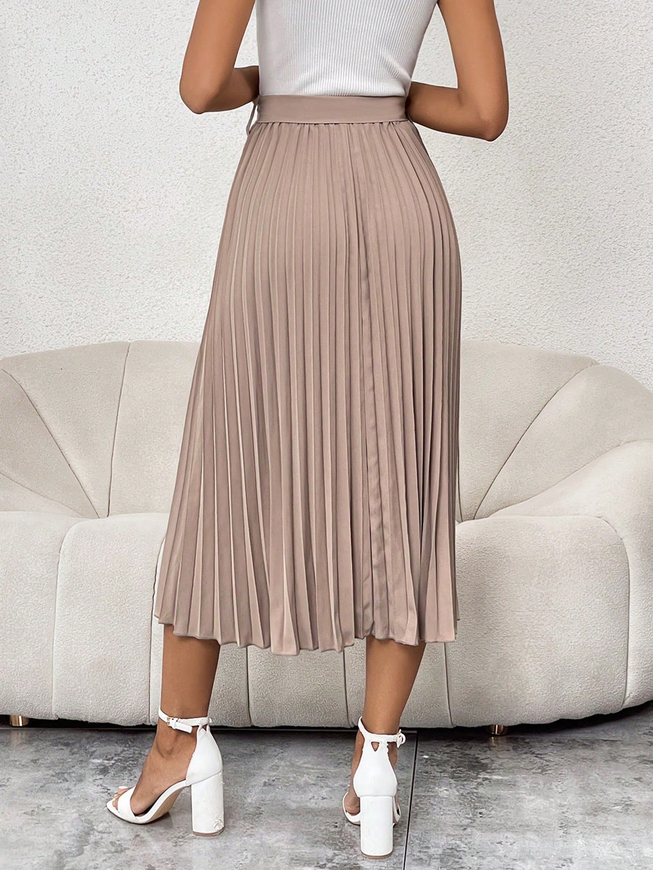 Solid Belted Pleated Skirt