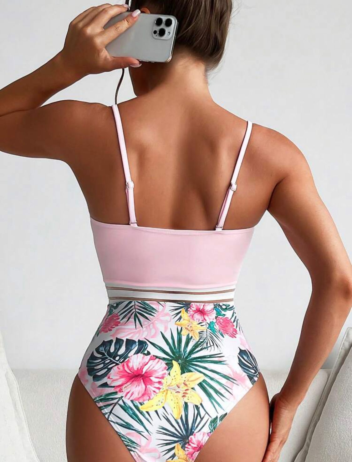 Tropical Print Contrast Mesh Push Up One Piece Swimsuit